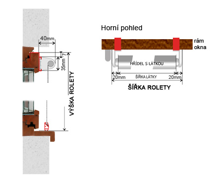 Výška rolety se měří od horního okraje rámu okna. Držáky s hřídelí jsou vysoké 35 mm a plastový úchyt vyčnívá nad hřídel